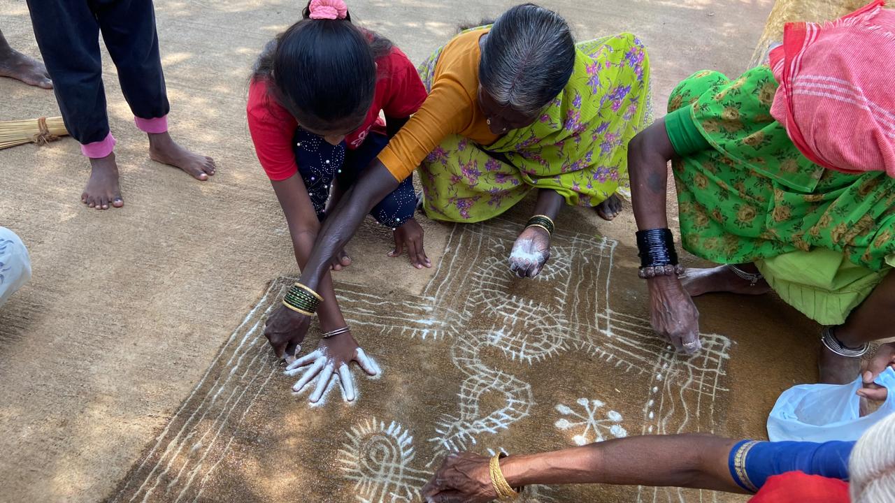 ಅಂಗೇ ರಂಗೋಲಿ ಮ್ಯಾಗೆ ಕಣ್ಣು ಹಾಕಿದೆ. ಪ್ರತಿ ಸಣ್ಣ ಅಂಶವನ್ನೂ ಬಿಡದೇ ಹಾಕಿದ್ದರು. ದೊಡ್ಡ ತೇರು, ತೇರಿನ ಮ್ಯಾಕೆ ಸೂರ್ಯ, ಚಂದ್ರ. ಸೂರ್ಯ ಅರ್ಧ ಚಂದ್ರಾಕೃತಿಯಲ್ಲಿದ್ದರೆ, ಹುಣ್ಣಿಮಿ ಚಂದ್ರ ಪೂರ್ಣಾಕಾರದಲ್ಲಿದ್ದ. ಸೂರ್ಯನ ಮುಂದ್ಕೆ ಒಂದು ಚೇಳು. ಅದು ಸೂರ್ಯನ ರಕ್ಷಣೆಗಂತೆ! ಮ್ಯಾಲೆ ಆಕಾಶ. ಅದರ ತುಂಬಾ ನಕ್ಷತ್ರಗಳ ರಾಶಿ. ತೇರಿನ ಮುಂದೆ ಬಂಡಿ, ಎತ್ತುಗಳು. ಹೆಡೆ ಬಿಚ್ಚಿದ ನಾಗಪ್ಪ ಕಾವಲಿಗೆ. ಒಟ್ಟಾರೆ ನೆಲಮೂಲ ಪರಂಪರೆಯ ಶ್ರಮದ ಬದುಕನ್ನು, ಬೆವರಿನ ಸಂಸ್ಕೃತಿಯನ್ನು ಬಿಂಬಿಸುವ ಚಿತ್ರಗಳು. ದೈನಂದಿನ ಏಕತಾನತೆಯ ದುಡಿಮೆಯಲ್ಲಿ, ಬಡತನದ ನೋವಿನಲ್ಲಿ ನಲಿವನ್ನು ಚಿಮ್ಮಿಸುವ ಆಚರಣೆ.