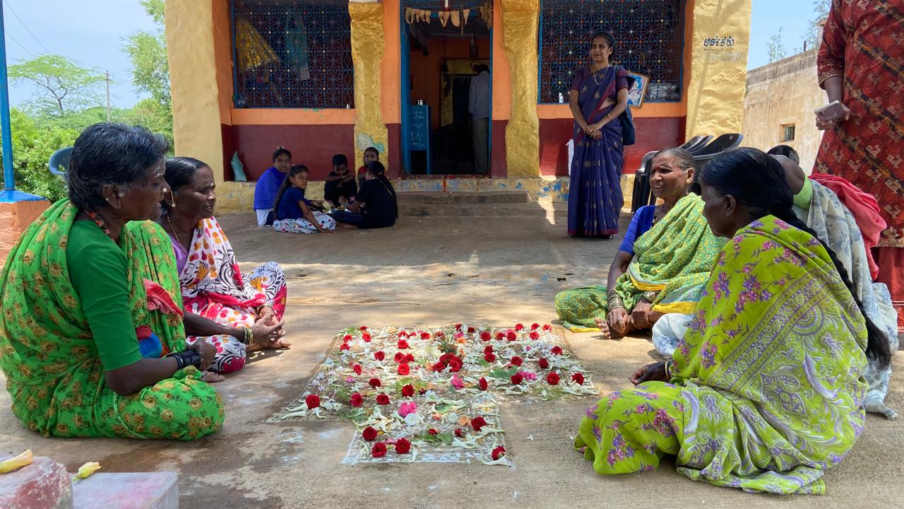 ರಂಗೋಲಿಯ ನಡುಮಧ್ಯೆ ಪುಟ್ಟ ಸೆಗಣಿ ಉಂಡೆ ಇಕ್ಕಿ ಅದರ ಮ್ಯಾಗೆ ದೀಪ, ಅದರ ಸುತ್ತಾ ಹೂವ. ಮುಂದಿಕ್ಕೆ ವಿಳೇದೆಲೆ ಅಡಿಕೆ, ಅರಿಸಿಣ, ಕುಂಕುಮ, ಬಾಳೆಹಣ್ಣು ಅದಿಕ್ಕೆ ಊದುಗಡ್ಡಿ ಸಿಕ್ಕಿಸಿ, ಸೋಬಾನೆ ಪದಗಳ್ನ ಸುರು ಹಚ್ಕೊಂಡ್ರು. ರಂಗೋಲಿ ಅತ್ಲಾಗೆ ಇತ್ಲಾಗೆ ಎದರಾಬದರಾ ಕುಂತು, ನಕ್ಕೊಂತಾ, ಒಬ್ರಿಗೊಬ್ರು ಕಾಲೆಳೆಕೊಂತಾ ಪದ ಯೋಳ್ತಿದ್ರೆ ಕೇಳೋಕೇಂತಾನೆ 20-30 ಜನ ಗುಂಪುಗೂಡಿದ್ದರು.