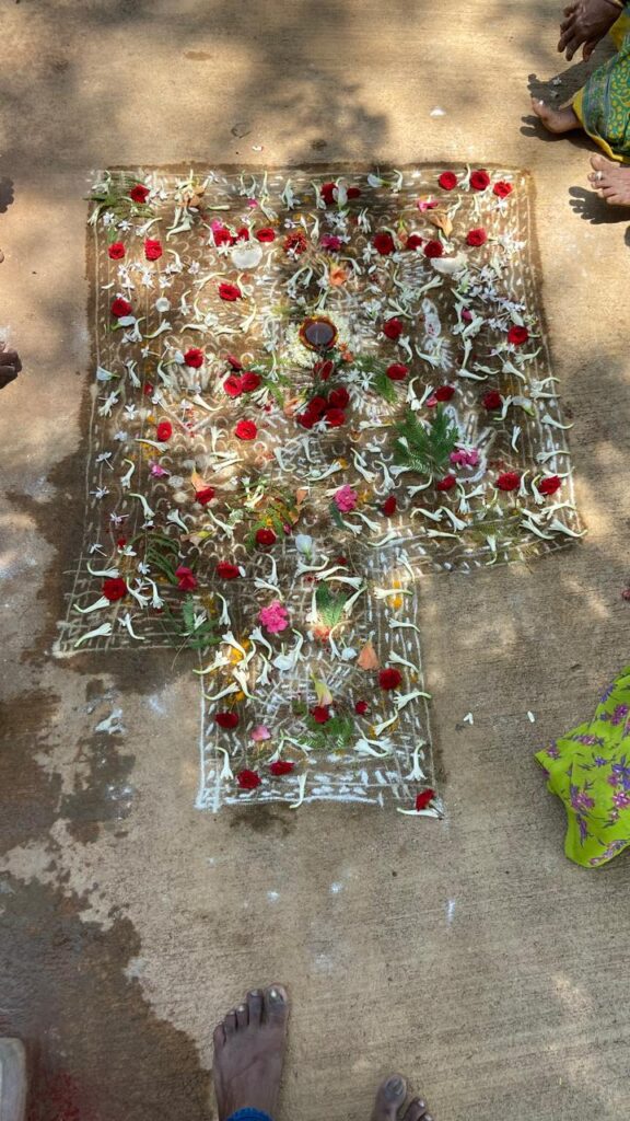 ಅಂಗೇ ರಂಗೋಲಿ ಮ್ಯಾಗೆ ಕಣ್ಣು ಹಾಕಿದೆ. ಪ್ರತಿ ಸಣ್ಣ ಅಂಶವನ್ನೂ ಬಿಡದೇ ಹಾಕಿದ್ದರು. ದೊಡ್ಡ ತೇರು, ತೇರಿನ ಮ್ಯಾಕೆ ಸೂರ್ಯ, ಚಂದ್ರ. ಸೂರ್ಯ ಅರ್ಧ ಚಂದ್ರಾಕೃತಿಯಲ್ಲಿದ್ದರೆ, ಹುಣ್ಣಿಮಿ ಚಂದ್ರ ಪೂರ್ಣಾಕಾರದಲ್ಲಿದ್ದ. ಸೂರ್ಯನ ಮುಂದ್ಕೆ ಒಂದು ಚೇಳು. ಅದು ಸೂರ್ಯನ ರಕ್ಷಣೆಗಂತೆ! ಮ್ಯಾಲೆ ಆಕಾಶ. ಅದರ ತುಂಬಾ ನಕ್ಷತ್ರಗಳ ರಾಶಿ. ತೇರಿನ ಮುಂದೆ ಬಂಡಿ, ಎತ್ತುಗಳು. ಹೆಡೆ ಬಿಚ್ಚಿದ ನಾಗಪ್ಪ ಕಾವಲಿಗೆ. ಒಟ್ಟಾರೆ ನೆಲಮೂಲ ಪರಂಪರೆಯ ಶ್ರಮದ ಬದುಕನ್ನು, ಬೆವರಿನ ಸಂಸ್ಕೃತಿಯನ್ನು ಬಿಂಬಿಸುವ ಚಿತ್ರಗಳು. ದೈನಂದಿನ ಏಕತಾನತೆಯ ದುಡಿಮೆಯಲ್ಲಿ, ಬಡತನದ ನೋವಿನಲ್ಲಿ ನಲಿವನ್ನು ಚಿಮ್ಮಿಸುವ ಆಚರಣೆ.