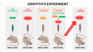 ಅವನು ಗಾಜಿನ ಬೀಕರ್ ಒಂದರಲ್ಲಿ ನುಣುಪು ಬ್ಯಾಕ್ಟೀರಿಯಾಗಳನ್ನು ಬಿಸಿ ಮಾಡಿ ಕೊಂದ. ಆ ಸತ್ತ ಬ್ಯಾಕ್ಟೀರಿಯಾಗಳನ್ನು ಆರೋಗ್ಯವಂತ ಇಲಿಗಳಿಗೆ ಇಂಜೆಕ್ಟ್ ಮಾಡಿದಾಗ, ಅವನೆಣಿಸಿದಂತೆಯೇ ಆ ಇಲಿಗಳಿಗೆ ನ್ಯುಮೋನಿಯಾ ಬರಲಿಲ್ಲ. ಆದರೆ, ಸತ್ತ ಆ ನುಣುಪು ಬ್ಯಾಕ್ಟೀರಿಯಾಗಳ ಶವಗಳನ್ನು ಬದುಕಿರುವ ಒರಟು ಬ್ಯಾಕ್ಟೀರಿಯಾಗಳೊಂದಿಗೆ ಮಿಶ್ರ ಮಾಡಿ ಇಲಿಗಳಿಗೆ ಇಂಜೆಕ್ಟ್ ಮಾಡಿದ ಕೂಡಲೇ, ಆ ಇಲಿಗಳು ನ್ಯುಮೋನಿಯಾಗೆ ತುತ್ತಾದವು. ಆ ಇಲಿಗಳ ರಕ್ತದ ಹನಿಯೊಂದನ್ನು ಮೈಕ್ರೋಸ್ಕೋಪಿನಲ್ಲಿಟ್ಟು ನೋಡಿದಾಗ ನುಣುಪು ಬ್ಯಾಕ್ಟೀರಿಯಾಗಳು ಹರಿದಾಡುತ್ತಿರುವುದು ಕಂಡುಬಂತು; ಸತ್ತ ಶವಗಳ ನುಣ್ಣನೆಯ ಕೋಟನ್ನು ಒರಟು ಬ್ಯಾಕ್ಟೀರಿಯಾಗಳು ಹೊದ್ದಿದ್ದವು! ಮತ್ತಷ್ಟು ಅಧ್ಯಯನ ನಡೆಸಿದಾಗ ಇನ್ನೊಂದು ವಿಷಯ ಹೊರಬಿತ್ತು; ನುಣುಪು ಮೈಯಿನ ಸತ್ತ ಬ್ಯಾಕ್ಟೀರಿಯಾಗಳು, ಅತ್ಯಾಶ್ಚರ್ಯಕರವಾಗಿ ನುಣುಪು ಕೋಟು ಮಾಡಿಕೊಳ್ಳುವ ಮಾಹಿತಿಯನ್ನು ಒರಟು ಮೈಯಿನ ಬ್ಯಾಕ್ಟೀರಿಯಾಗಳಿಗೆ ತಲುಪಿಸಿದ್ದವು. ಬ್ಯಾಕ್ಟೀರಿಯಾಗಳ ವಿರುದ್ಧ ಯುದ್ಧ ಮಾಡುತ್ತಿದ್ದವನಿಗೆ, ಅಕಸ್ಮಾತ್ ಆಗಿ ಜೀನ್ ಒಂದು ಕೆಲಸ ಮಾಡುವುದು ಕಣ್ಣಿಗೆ ಬಿದ್ದಿತ್ತು. ಗ್ರಿಫಿತ್ ಅದನ್ನು “ಪರಿವರ್ತಕ ಸಿದ್ಧಾಂತ” (“ಟ್ರಾನ್ಸ್ಫಾರ್ಮಿಂಗ್ ಪ್ರಿನ್ಸಿಪಲ್”) ಎಂದು ಕರೆದ.