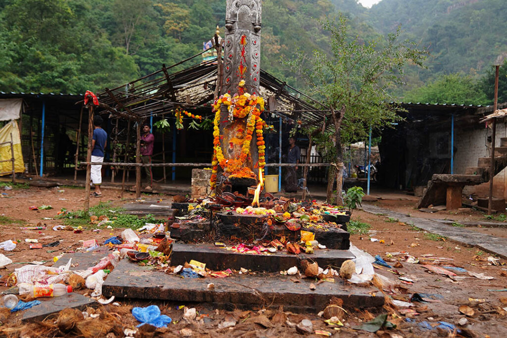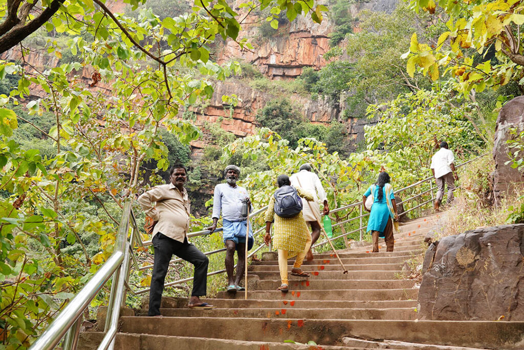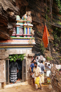 ಬೃಹತ್ ಮರಳು ಶಿಲೆಯೊಂದು ನಿಮ್ಮನ್ನು ಕೆಳಗಿನಿಂದಲೇ ಕರೆಯುತ್ತದೆ. ಬಹೃತ್ ಶಿಲೆಯ ಜಟೆಯಿಂದ ಧುಮುಕುವ ನೀರ ಹನಿಗಳ ಪ್ರೋಕ್ಷಣೆಗೈದು ದೇವಾಲಯ ಪ್ರವೇಶಿಸಬೇಕಾಗುವುದು ಇಲ್ಲಿನ ವಿಶೇಷ. ಮೂರು ಜಲಕನ್ನಿಕೆಯರು ನಿಮ್ಮ ಬರುವಿಕೆಗಾಗಿ ಕಾಯುವರು. ಬನ್ನಿ ಹಾಗೆ ಮುಂದೆ ಹೋಗೋಣ.