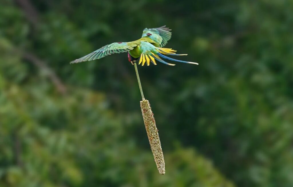 ಇದಕ್ಕೂ ವೈವಿಧ್ಯಮಯ ಹಕ್ಕಿಗಳನ್ನು ನೋಡಬೇಕೆಂದರೆ, ಪೈರುಗಟ್ಟಿದ ಭತ್ತದ ಗದ್ದೆಗೆ ಬರಬೇಕು. ಭತ್ತ ಆಗತಾನೇ ಹಾಲುದುಂಬಿ ಮೈತುಂಬಿಕೊಂಡು ಉದ್ದುದ್ದ ತೆನೆಯಾಗಿ ತಲೆಯೆತ್ತಿ ನಿಲ್ಲುವ ವೇಳೆಯಲ್ಲಿ, ಕಾಡಲ್ಲಿರುವ ಪಕ್ಷಿ ಪ್ರಪಂಚಕ್ಕೆ ಅದ್ಯಾರು ಸಂದೇಶ ಮುಟ್ಟಿಸುತ್ತಾರೋ ದೇವರೇ ಬಲ್ಲ. ಹೊತ್ತು ಮೂಡುತ್ತಲೇ ಕಿಚ್ ಪಿಚ್ ಕಿಚ್ ಅಂತ ಗಲಾಟೆ ಹಾಕುತ್ತಲೇ ಹಿಂಡುಗಟ್ಟಿ ದಾಂಗುಡಿಯಿಟ್ಟು, ಒಂದೆಡೆಯಿಂದ ಭತ್ತದ ಕಾಳನ್ನು ಕಬಳಿಸ ತೊಡಗುತ್ತಿದ್ದವು. ಆಗೆಲ್ಲ ಡಬ್ಬಿ ಬಡಿಯುತ್ತ, ಹಾ, ಹಾ ಎಂದು ಕೆಟ್ಟ ದನಿ ತೆಗೆದು ಕೂಗುತ್ತ ಅವುಗಳನ್ನು ಓಡಿಸುವ ಫುಲ್ ಟೈಂ ಡ್ಯೂಟಿ ನಮ್ಮಂಥ ಮಕ್ಕಳದಾಗುತ್ತಿತ್ತು. ಎಷ್ಟೋ ಸಾರಿ ಅವುಗಳನ್ನು ಓಡಿಸಲು ಪಟಾಕಿಯನ್ನೇ ಹೊಡೆಯ ಬೇಕಾಗುತ್ತಿತ್ತು. ಹಾಲು ತುಂಬಿ ಕಾಳು ಗಟ್ಟಿಯಾಗುವ ತನಕ ಈ ಹಕ್ಕಿಗಳ ಕಾಟವಾದರೆ, ಬಲಿತ ಮೇಲೆ ಗಿಳಿಗಳ ಕಾಟ. ಉಳಿದ ಹಕ್ಕಿಗಳು ಒಂದೊಂದು ಕಾಳಾಗಿ ತಿಂದರೆ, ಈ ಗಿಳಗಳ ಹಿಂಡು ಇಡೀ ತೆನೆಯನ್ನೇ ಚಕ್ಕನೆ ಕೊಯಿದು ಹೊತ್ತೊಯ್ಯುತ್ತಿದ್ದವು. ಏನೇ ಅನ್ನಿ ಎಲ್ಲ ಹಕ್ಕಿಗಳಿಗಿಂತ ಈ ಗಿಳಿಗಳು ಚಂದ. ಬಾಳೇ ಗಿಳಿ, ಪಟ್ಟೆ ಗಿಳಿ, ಉದ್ದುದ್ದ ಬಾಲದಂತ ಕದಿರು ಗಿಳಿ ಇನ್ನೂ ಅದೆಷ್ಟೋ ವೈವಿಧ್ಯಮಯ ಗಿಳಿಗಳು ಶಿಳ್ಳೆ ಹೊಡೆದಂತೆ ಕೂಗುತ್ತ ಚೊಂಚು ಕುಣಿಸುತ್ತ, ವೈಯ್ಯಾರದಿಂದ ನಿತ್ಯ ಗದ್ದೆಗೆ ಬಂದು ದಾಂದಲೆ ಹಾಕುತ್ತಿದ್ದವು.